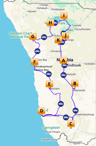Dag 1:- Brussel via Frankfurt – Windhoek Routekaart onderaan
